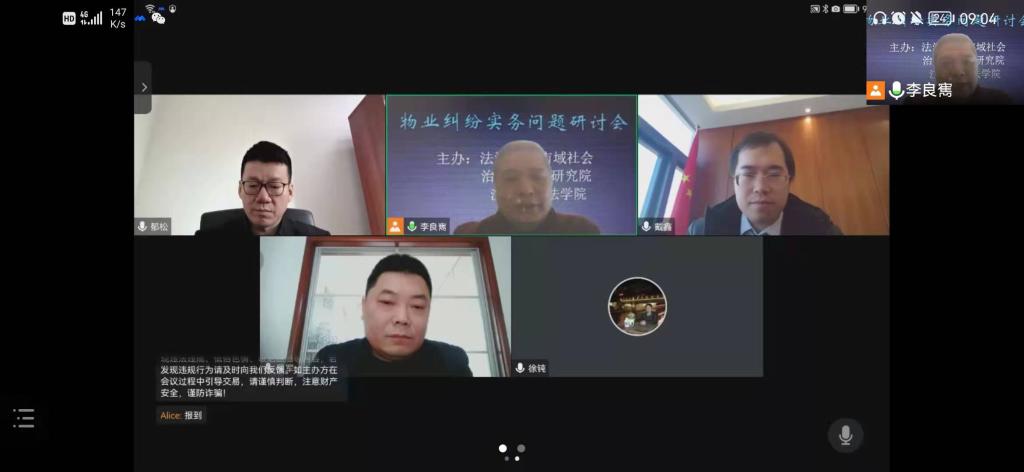 为更好地依法处理物业纠纷、解决市域社会治理现代化过程中老百姓关心的热点、痛点问题,法治无锡·市域社会治理现代化研究院、永利3544am登录官网于12月26日举办了主题为“物业纠纷实务处理”的线上研讨会,会议由我院李良寯老师主持,与会各界专家学者包括滨湖区法院郁松庭长、炜衡律师事务所戴鑫律师、滨湖区住建局吴军科长以及我院徐钝老师等。