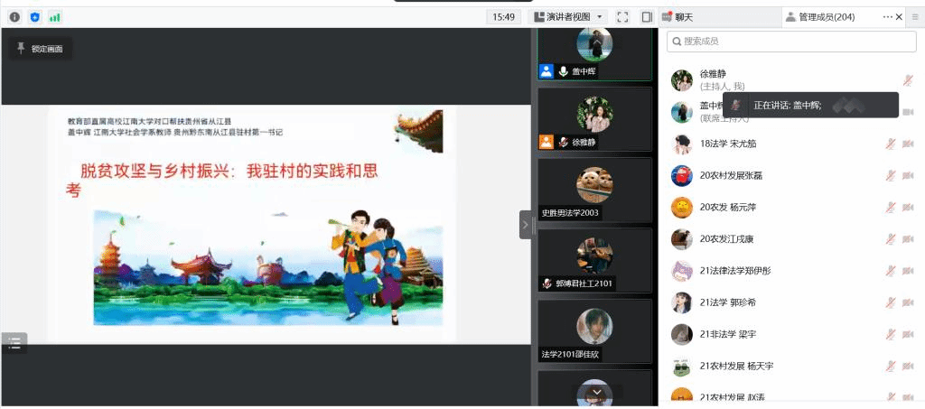 5月11日下午,永利3544am登录官网“德法力行讲坛”第18期在线上顺利进行,永利3544am登录官网教师盖中辉作了题为《脱贫攻坚与乡村振兴——苗乡侗寨里的帮扶实践与思考》的专题讲座。本次讲座由分团委书记徐雅静主持,学院各年级学生共三百余人参加。