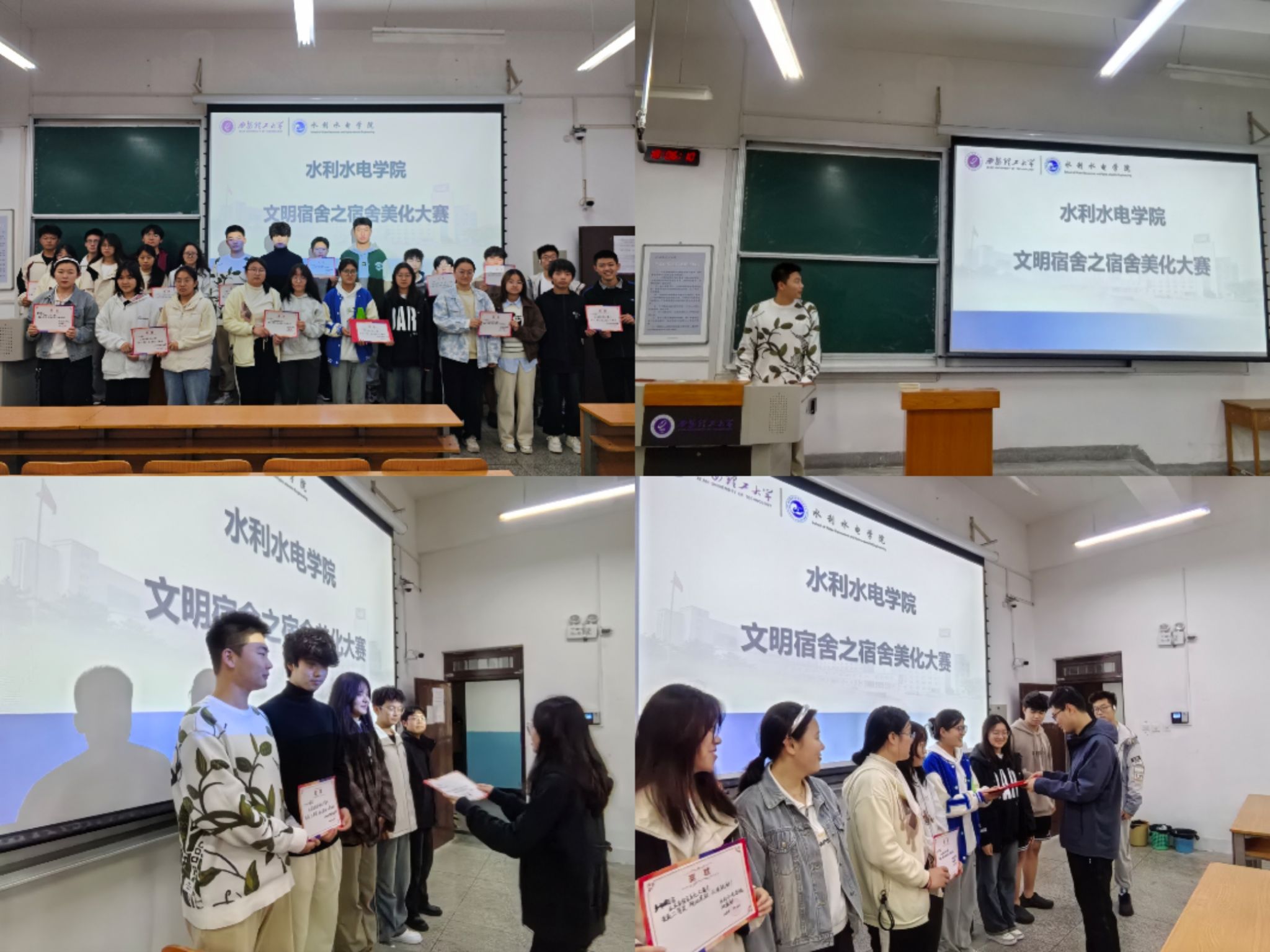 经过宿舍自荐、每周检查、照片评比、现场讲评等环节,最终11-356(工242)、3-418(工卓241)获得一等奖,11-408(工卓241)、3-408(给241)、11-411(工卓242)、3-417(工244)获得二等奖,11-404(工244)、3-422(能动242)、11-420(能动242)、3-429(水文241)、11-442(水文241、能动242)、3-427(农水242)、11-416(能动241)、3-425(能源241)获得三等奖,各位老师为获奖宿舍颁奖。