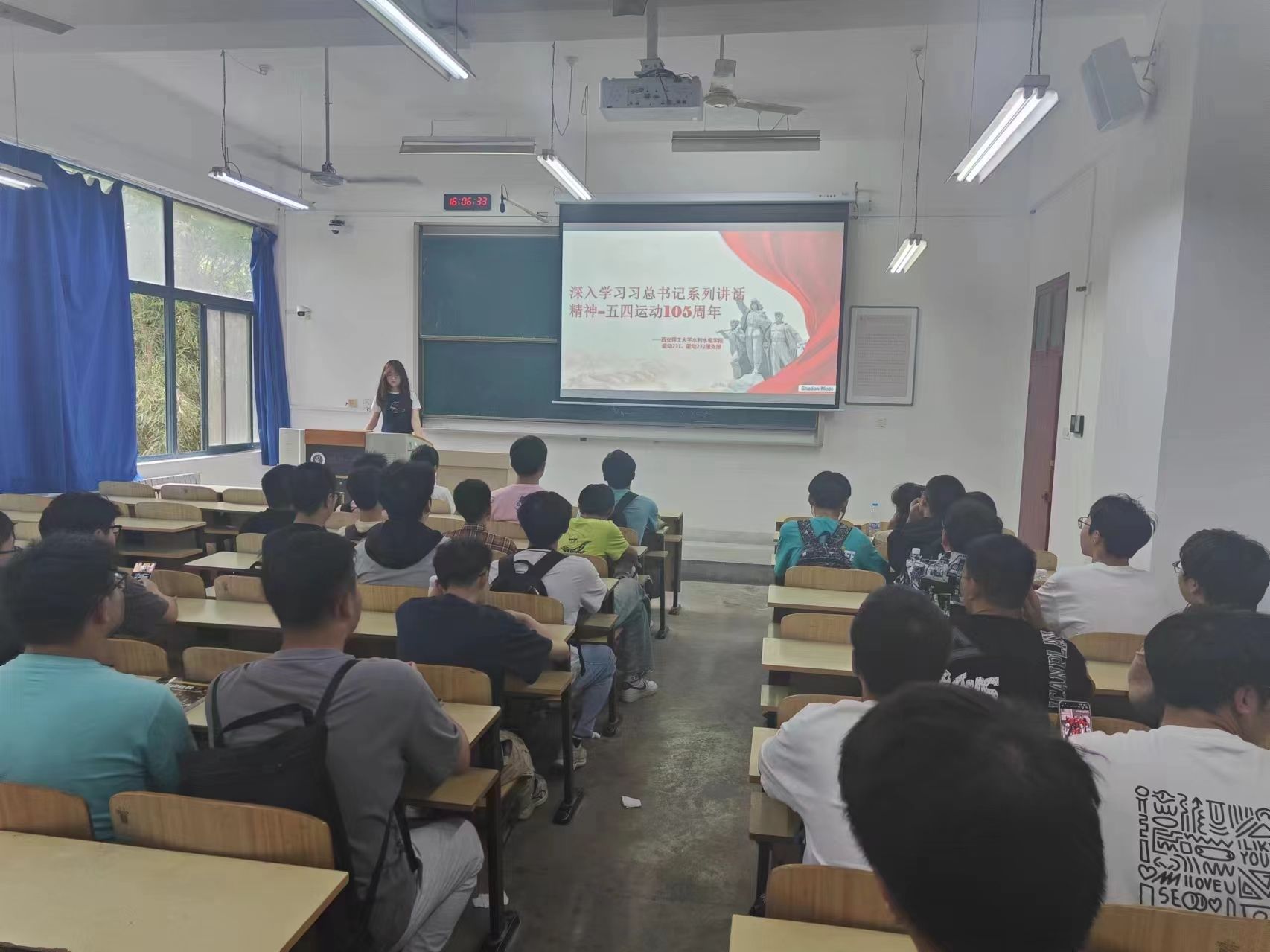 活动中,全体学生共同学习了习近平总书记关于“五四运动”的重要讲话精神,深刻领会新时代青年的历史使命和担当。谭玉蕾同学做了题为“青年怀壮志,奋进正当时”的分享。辅导员贾向宁希望广大同学以“五四运动”革命先辈为榜样,坚定理想信念,勇于担当作为,为实现中华民族伟大复兴的中国梦贡献青春和力量。