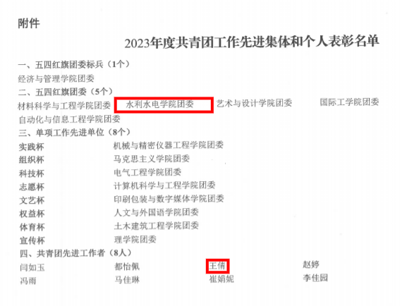 近日,共青团西安理工大学委员会印发《关于表彰2023年度先进集体和个人的决定》,金年会官网团委荣获“2023年西安理工大学五四红旗团委”称号,学院团委书记王倩获“2023年西安理工大学共青团先进工作者”称号,水工201等五个团支部荣获“五四红旗团支部”,叶旭获“优秀共青团员标兵”、刘悦等91人获“优秀共青团员”,顾晓蕾等71人获“优秀共青团干部”。