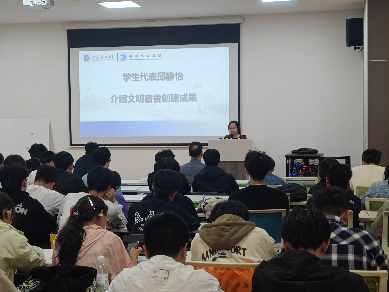 文明宿舍获奖学生代表邱静怡,通过PPT生动展示了文明宿舍创建成果。从一尘不染的书桌地面,到别出心裁的宿舍文化墙,从共同制定的“宿舍公约”,到一起获得的荣誉证书,一个个鲜活的例子充分证明,文明宿舍不仅是荣誉的象征,更是良好生活习惯和深厚室友情谊的体现,为新生宿舍树立了优秀的榜样。