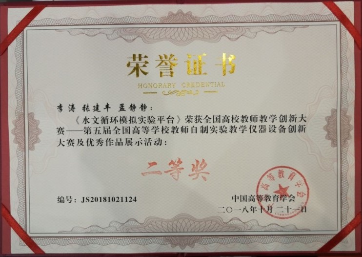 金年会jinnianhuicom(水利水电国家级实验教学示范中心)积极响应,充分发挥在自制实验仪器设备方面的传统优势,选送的两个参赛项目获奖,取得优异成绩。其中,“水文循环模拟实验平台”(李涛、张建丰、孟静静)获得二等奖,“水文水资源虚拟仿真实验教学系统”(解建仓、罗军刚、魏娜、张晓、汪泥)获得三等奖。西安理工大学共有5个项目参加决赛,获得1个二等奖,4个三等奖,并获得团体奖,是参加该项赛事以来的最佳成绩。