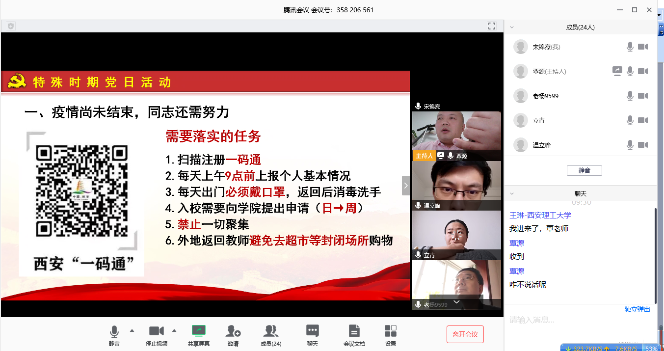 此次党日活动围绕“抗击疫情、保证教学、解决问题”展开。首先,覃源组织大家深入学习了习近平总书记关于疫情防控工作重要讲话、重要指示批示精神,强调了疫情防控期间教职工返城返校工作的秩序和要求,督促大家严格按照学校的工作部署执行。其次,根据教育部“停课不停学”的要求,水工支部要灵活组织好线上教学,支部教师要实现角色转变,保证教学质量。并要求前四周没有课的党员必须加入到即将开设的四门课程的授课群,服务上课教师,服务全体学生。最后,要求各班导师继续关注班级内重点地区学生,做到帮扶帮助到位、学习支持到位、情况沟通到位、关心关怀到位。