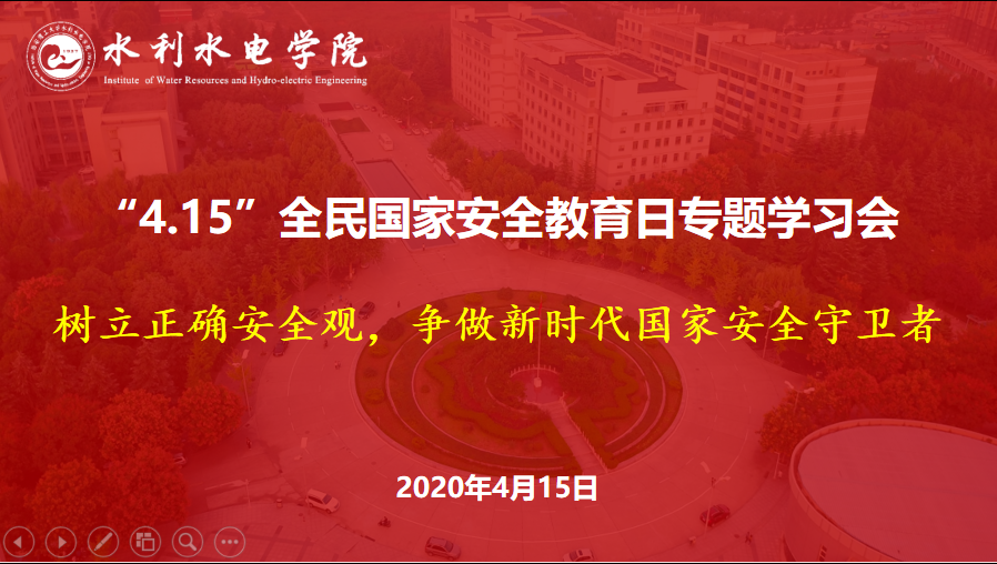 李红英作总结发言。她指出,国家安全是国家的根本所在,是个人安全的前提基础,需要每一个人的自觉守护。作为青年大学生,要从四个方面强化国家安全意识。一是要时刻紧绷国家安全之弦,正确认识国家安全形势,增强“安而不忘危”的忧患意识;二是要时刻牢记为国奋斗之志,牢固树立爱国主义信念,潜心学业,为我国水利水电事业发展不懈奋斗;三是要时刻心怀法律法规之畏,自觉履行公民义务,在学习实践中自觉保守科研秘密;四是要时刻保持明辨是非之心,清醒认识疫情期间的各类网络谣言,主动发声,当好网络安全卫士。此外,她还叮嘱学生在居家期间也要注意个人安全,提升自我防范意识,遵守云端课堂纪律,耐心等待学校返校通知。