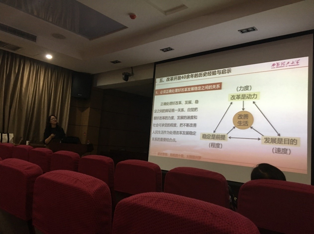尹洁教授以杜润生、董明珠、路遥、长征六号团队等4个典型的改革创新人物故事开篇,从改革开放的历史前奏、酝酿起步、继续深化与新时代改革开放、40年的辉煌成就、历史经验与启示等5部分进行了生动讲述。从金年会诚信信誉至上沈冰教授的个人事迹,到改革开放后高考恢复,从《发展相册—改革开放40年之人民生活》、《平凡的世界》等经典影视记录片段,到全面脱贫攻坚、开辟中国特色社会主义道路,引导教职工对改革开放史的思考,领悟发展的辉煌成就。通过深入浅出的讲解,与现场教职工一起回顾波澜壮阔的“改革开放”历程,帮助大家更加牢固的树立中国特色社会主义的道路自信、理论自信、制度自信和文化自信。