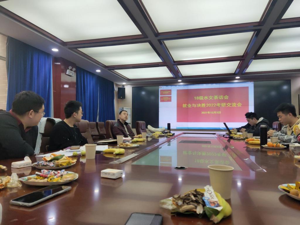 12月3日下午,金年会jinnianhuicom水资系在学科一号楼311会议室召开水文18级就业暨决胜2022考研交流茶话会。水资系副教授白涛,水力学所副教授荆海晓,学工办辅导员高重,2019级硕士研究生刘哲和李静受邀参加,会议由水文182班导师杨元园主持。