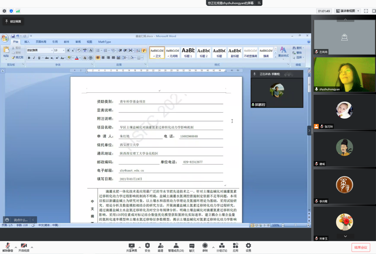 郭鹏程对沙龙进行了总结发言,并从项目依据、研究内容、研究方案、创新与特色等方面,对每个青年基金项目进行了详细的点评,详细阐述了撰写基金申请时应注意的事项,为青年教师提供了许多独特的见解。此次活动极大鼓舞了全院青年教师的申报热情,为2022年国家自然基金项目申报奠定了良好基础。