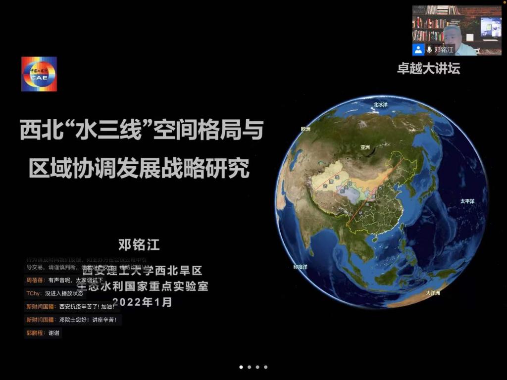 1月18日下午,金年会jinnianhuicom线上上举办了“卓越大讲坛·对话院士”报告会,中国工程院院士邓铭江作了题为“西北‘水三线’空间格局与区域协调发展战略”的报告,中电建西北院、中铁隧道局、天津大学等兄弟高校师生、水利行业专家、学者700余人参加了此次报告会。