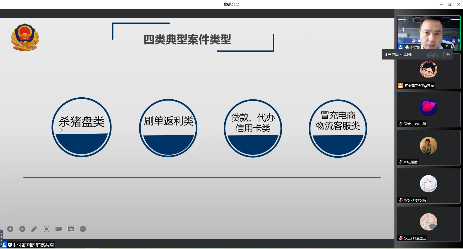 为增强学院学生对各类诈骗方式的鉴别能力和自我安全防范意识,防止奖、助学金被骗事件的发生。5月27日,金年会jinnianhuicom邀请宝鸡市扶风县刑事侦查大队中队长付武刚警官,通过线上腾讯会议的方式开展“诚信感恩 励志成才”防诈骗安全教育主题讲座。