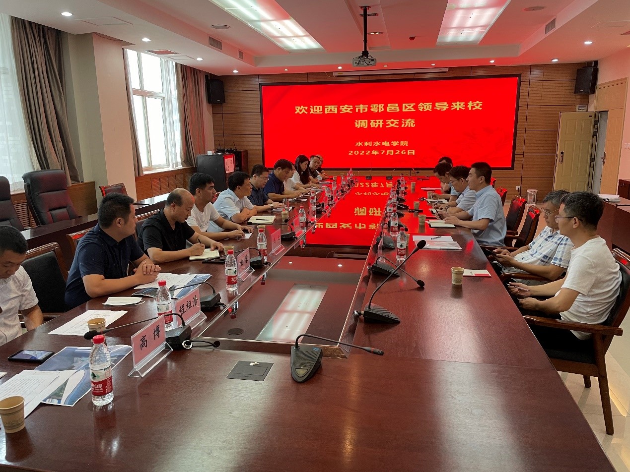 7月26日,西安市鄠邑区纪委监委常委米君虎带领鄠邑区水务局一行12人就“鄠邑区水生态警示教育中心”来金年会官网调研交流,金年会诚信信誉至上院长郭鹏程、副院长李炎隆、周蓓蓓、省部共建西北旱区生态水利国家重点实验室副主任潘保柱、罗军刚及学院相关教师代表参加了座谈交流会,会议由李炎隆主持。