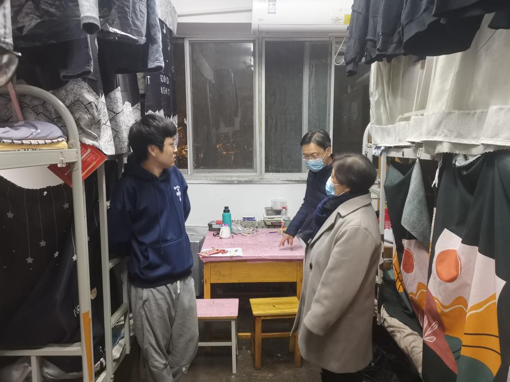 在学生宿舍,李红英、吴罗长和杨帆与同学们亲切交谈,李红英在交谈过程中勉励毕业生找准自我定位,关注学院定点推送的就业信息,调整好心态积极就业;鼓励准备考试的学生认真复习,熟悉专业知识,顺利完成学业。吴罗长提醒同学们要遵守校园安全管理规章制度,坚持做好疫情防控工作,自觉维护宿舍安全、保持宿舍卫生整洁,积极营造安全、文明、健康、舒适的学习生活环境,携手共建文明校园。