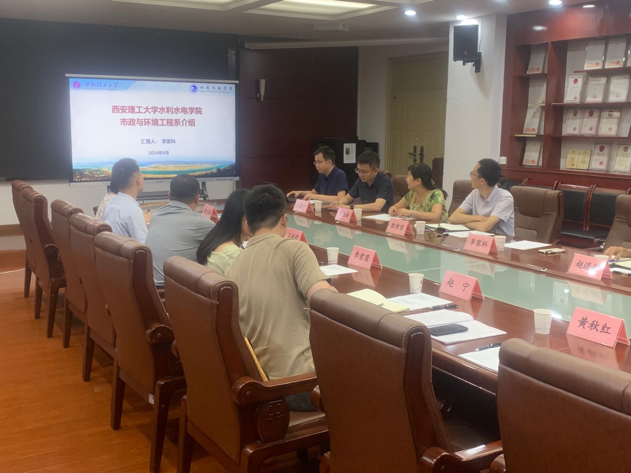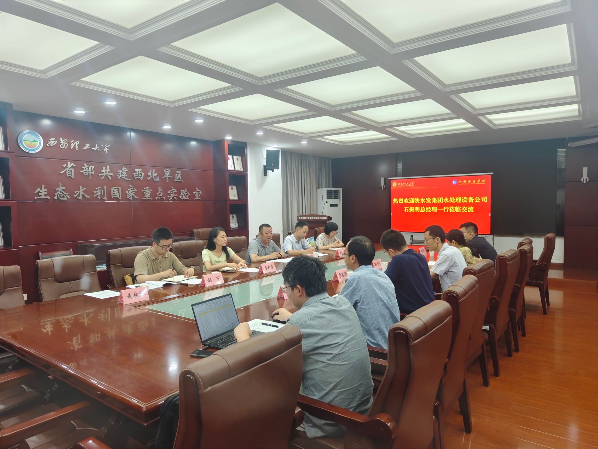 2024年6月28日,陕西省水务发展集团水处理设备有限公司党委副书记、董事、总经理石振明、水处理设备公司技术部副部长李君荣、工艺工程师郭鹏和电气自控工程师赵宁等一行四人来金年会官网金年会jinnianhuicom进行调研交流。金年会jinnianhuicom副院长郭梦京、市政与环境工程系主任李家科、副主任王东琦、教师代表刘玉玲、徐志嫱和动力工程系赵道利等参加了座谈交流。交流会由市政与环境工程系副主任张耀中主持。