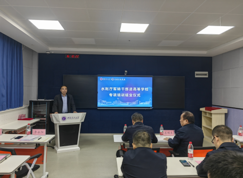 10月23日,陕西省水利厅军转干部进高等学校专项培训结业仪式在金年会官网金花校区教一楼303举行。金年会jinnianhuicom党委书记王瑞生,实验室管理处副处长吴罗长,学院党委副书记李永阳,学工办主任杨帆,授课教师代表吴军虎、任杰、宋志强,以及本期培训学员参加了结业仪式。