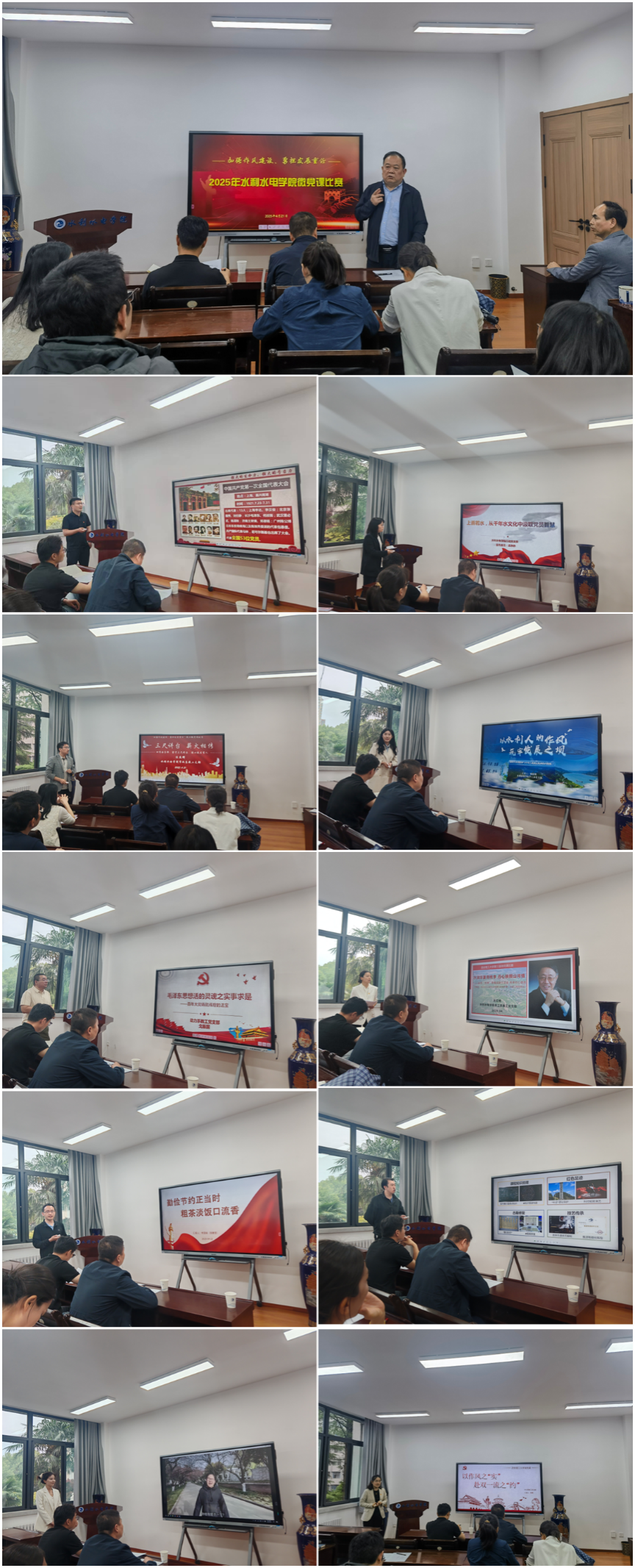 参赛选手以8分钟现场微课的形式,从多个角度阐述了加强作风建设,以好作风好形象奋进新征程、建功新时代的主题内容。选手们从“小切口”引出“大主题”,用“小故事”讲明“大道理”,以身边人讲述身边事,用身边事感染身边人,将主题鲜明化、内容鲜活化。水资系教工党支部杨雪老师以“以作风之‘实’,赴双一流之‘约’”为主题,以作风建设与双一流建设的时代使命为切入点,交流了中央八项规定精神的核心要义,以及以好作风赋能“双一流”建设新征程的使命担当。学工办党支部杨安琪老师以新时代水利精神与中央八项规定精神的内核统一为题,交流了两者之间的紧密内在联系。通过深入探究新时代水利精神与中央八项规定精神在本质上的统一,分享了西理工水利人如何以此为指引,筑牢事业发展的坚实堤坝,在助力“双一流”的新征程上贡献水利力量。行政党支部孟静静老师从历史维度、精神维度、实践维度三个维度分享从千年水文化中汲取的党员智慧。市政系教工党支部任杰辉老师从新时代高校教师职责及定位入题,结合学院部分教师教书育人的典型事例,分享了不忘教师初心,做新时代的“大先生”的时代使命。各位选手都以精彩的内容展示了良好的精神风貌。
