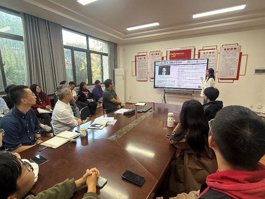 硕士生王佳璐带来了她在丹麦奥胡斯大学的访学见闻。她详细介绍了如何参与“电活性生物膜构建湿地”和“基于METland系统的温室气体减排”两个国际前沿项目。从野外采样、设备布设到实验室的样品检测分析,王佳璐同学的讲述让大家看到了海外科研训练对提升动手能力和实验设计严谨性的重要作用。