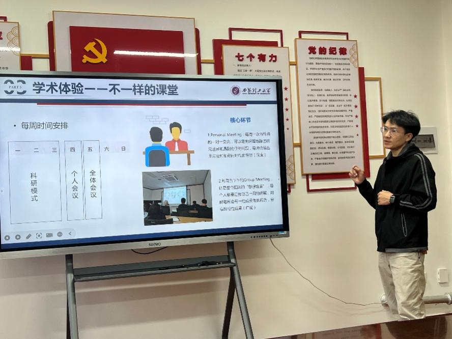 博士生杨贵斌以他在韩国浦项科技大学(POSTECH)的访学经历,为同学们带来了详尽的“实战攻略”。他将出国访学的申请过程形象地比喻为“国内”与“国外”两条并行的战线,风趣幽默地讲解了从联系导师、准备材料到办理签证、安排住宿的全流程。在学术体验方面,他分享了课题组“一对一交流”与“团队思想盛宴”相结合的高效科研模式,为有意出国交流的同学提供了宝贵经验。