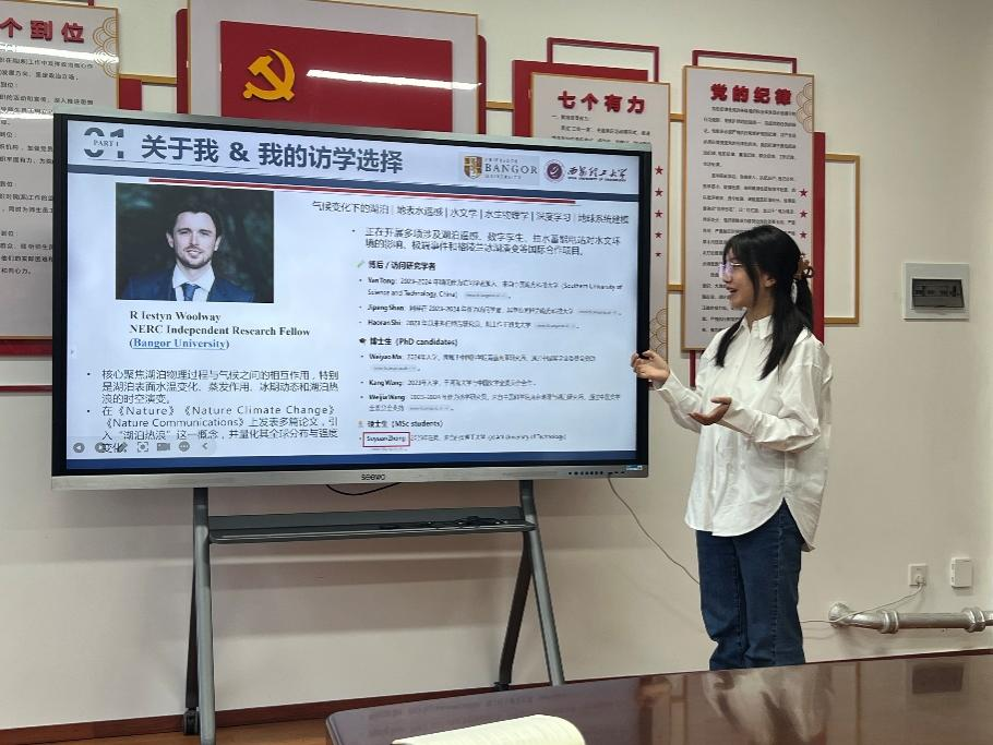 硕士生钟素媛分享了她在英国班戈大学跟随气候变化领域著名学者Iestyn Woolway教授进行前沿课题研究的经历。她的分享聚焦于“目标明确的学术奔赴”,展示了她如何带着对“全球湖泊热浪”这一前沿课题的浓厚兴趣,成功申请并深度参与到导师的科研项目中。她生动阐述了如何利用Landsat卫星影像和ERA5-Land再分析数据进行全球尺度科学研究,让在场同学深刻感受到了国际前沿科研。