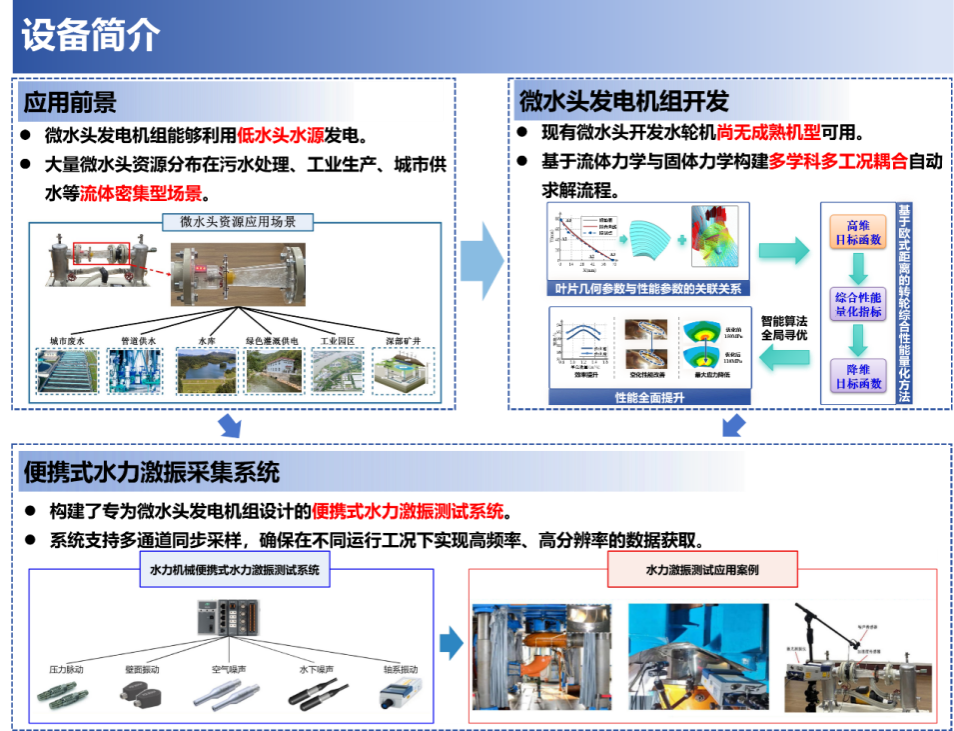 项目介绍:水电作为应用广泛的可再生能源,其中城市废水、管道供水、水库及深部矿井等微水头资源蕴藏着巨大的开发潜力。现有微水头开发所用水轮机尚无成熟机型可以使用,本团队构建了基于流体力学与固体力学的多学科耦合自动求解流程。同时为保障其长期稳定运行,本团队自行构建了专为微水头发电机组设计的便携式水力激振测试系统,该系统支持多通道同步采样,确保在不同运行工况下实现高频率、高分辨率的数据获取。基于采集的信号将故障诊断、早期空化识别及运行风险预警三个模块结合于一体,搭建了适配微水头发电机组的多源协同感知平台