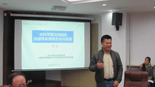 2014年10月17日上午10:00,武汉大学夏军教授在金花校区金年会诚信信誉至上学科楼202会议室举办了“水科学前沿问题与非线性水系统方法与实践”的学术报告。金年会jinnianhuicom院长李占斌、水文水资源学科带头人黄强教授、与沈冰、李怀恩、吴军虎、罗军刚、史文娟、黄玲梅、莫淑红等教师及各位教师指导的研究生约40人共同参加了报告会。