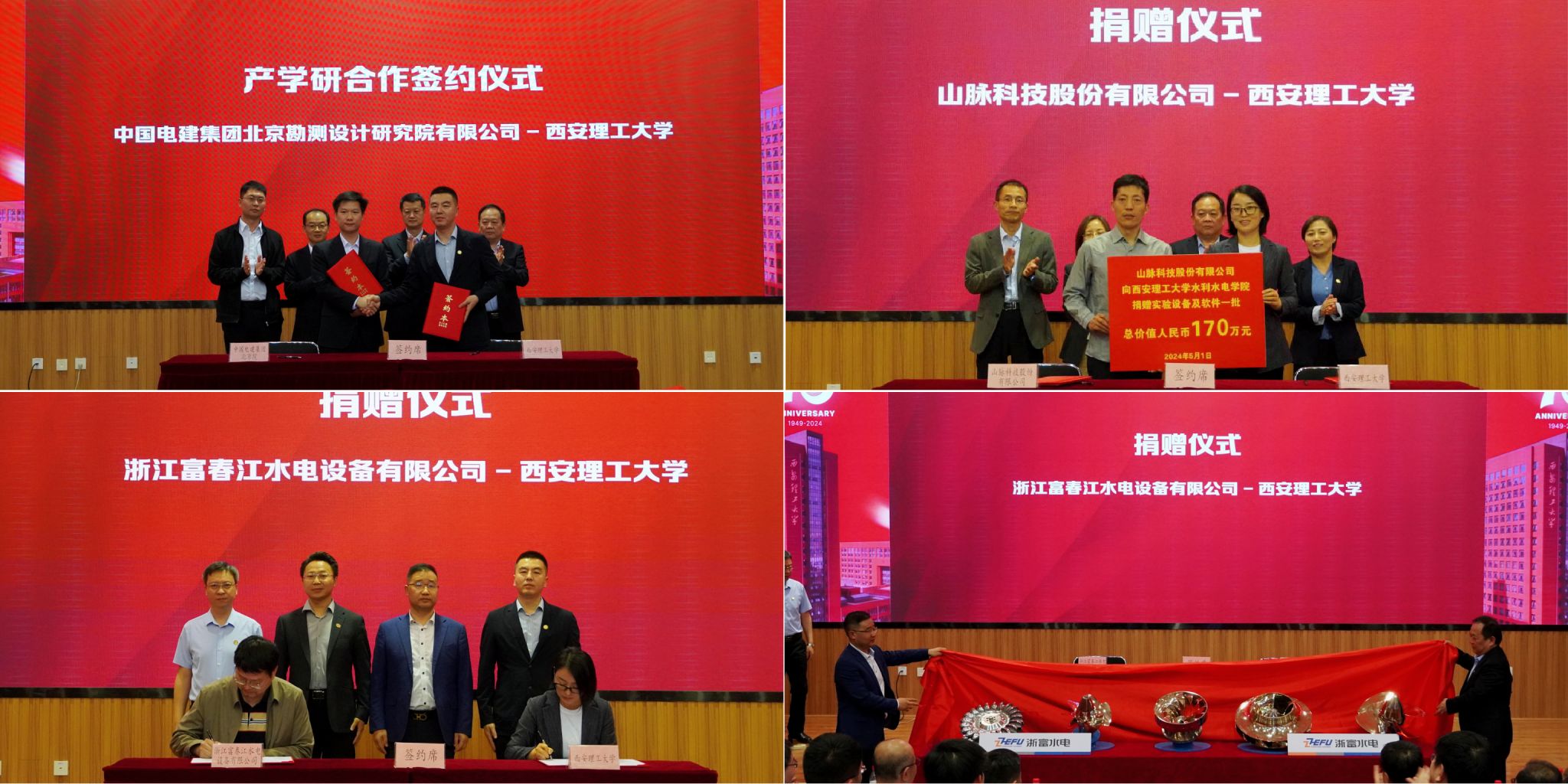校企合作促发展,共建共赢谱新篇,本次会议上金年会官网与多家友好企业推进了深层次的合作与共建。中国电建集团北京勘测设计研究院有限公司与金年会官网签订了产学研合作协议,大禹节水集团股份有限公司、山脉科技股份有限公司和浙江富春江水电设备有限公司向学院捐赠了共计498.83万元的科研设备。西安理工大学水利水电建筑勘测设计有限公司总经理杨杰从公司历史沿革、组织架构、业务范围、资质与业绩、发展与愿景等方面进行合作推介。校企双方将持续在项目合作、人才培养、专业建设等方面实现互利共赢。